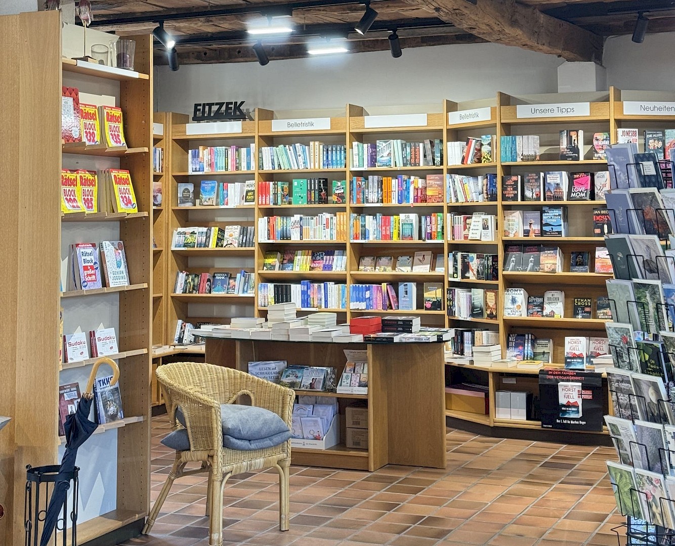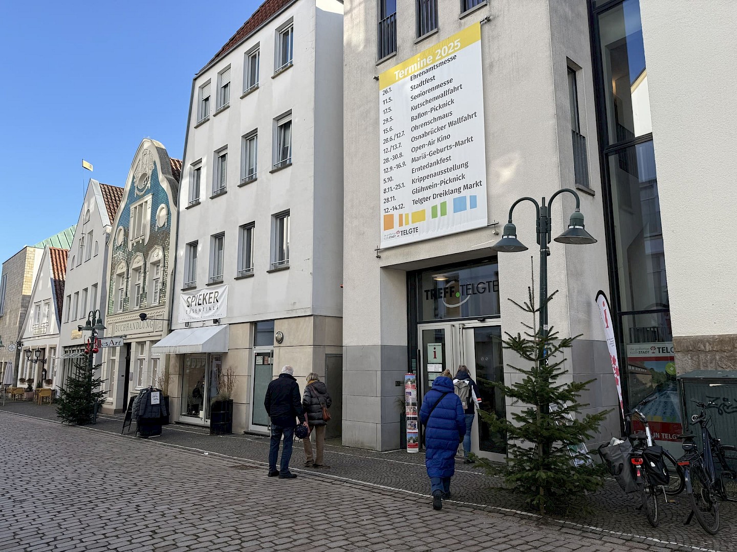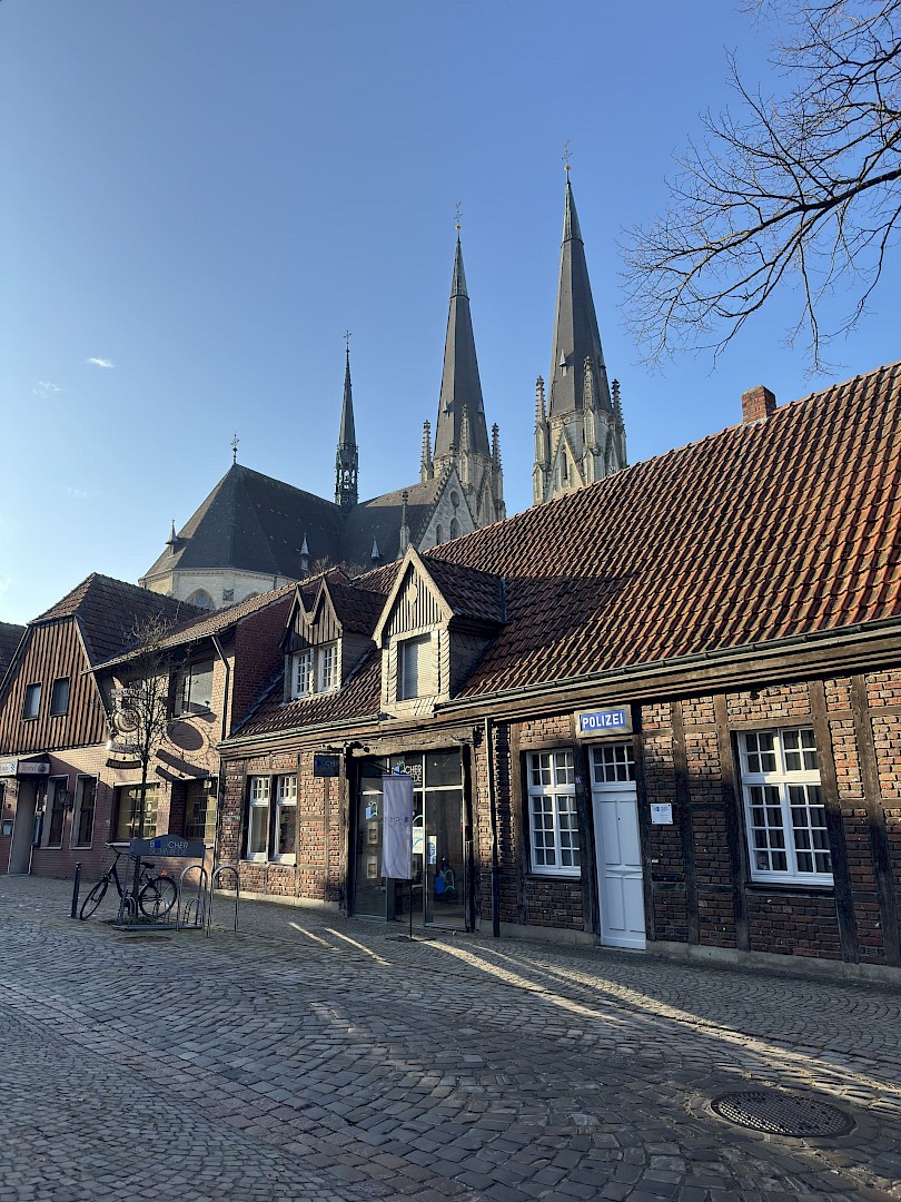 In der Bücherschmiede trifft Buchhandlungswärme auf Billerbecker Altstadtcharme. Das Fachwerkhaus schafft sofort eine gemütliche Atmosphäre, dazu kommt der Blick in Richtung Ludgerus Dom, dessen Türme als Wahrzeichen der Stadt gelten. Zwischen Regalen voller Geschichten entsteht genau der richtige Ort zum Stöbern, Entdecken und Verweilen.