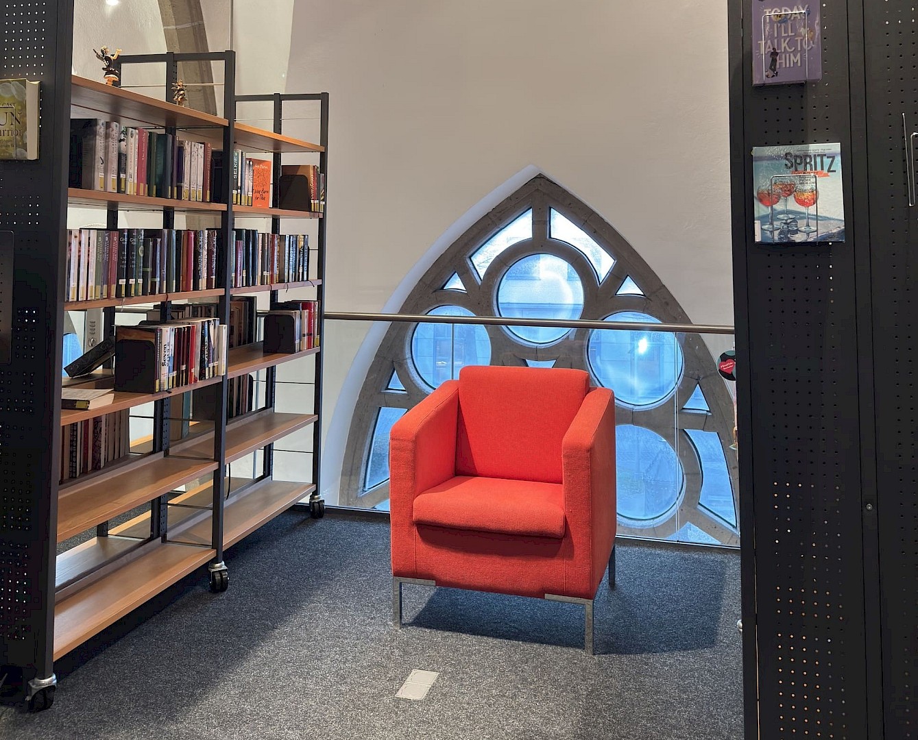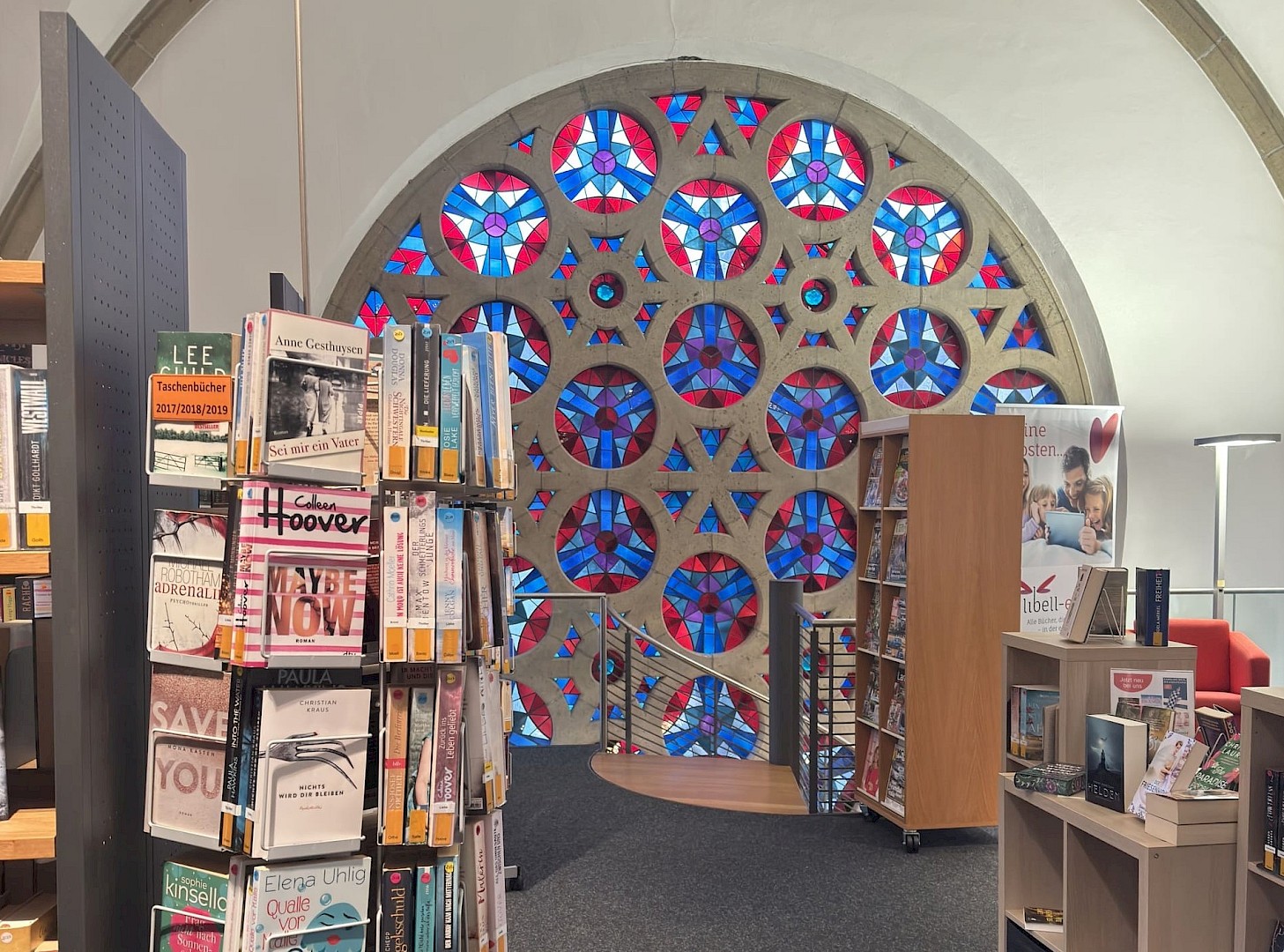 Mitten im Kirchenschiff der katholischen St. Dionysius Kirche liegt ein besonders stimmungsvoller Leseort: die Katholische Öffentliche Bücherei St. Dionysius. Die barrierefreie Bücherei im Seitenschiff verbindet ruhige Atmosphäre mit einer überraschend großen Auswahl auf zwei Etagen und ist als „Treffpunkt Bücherei“ zugleich ein gelebter Begegnungsort für Austausch und Kommunikation.
