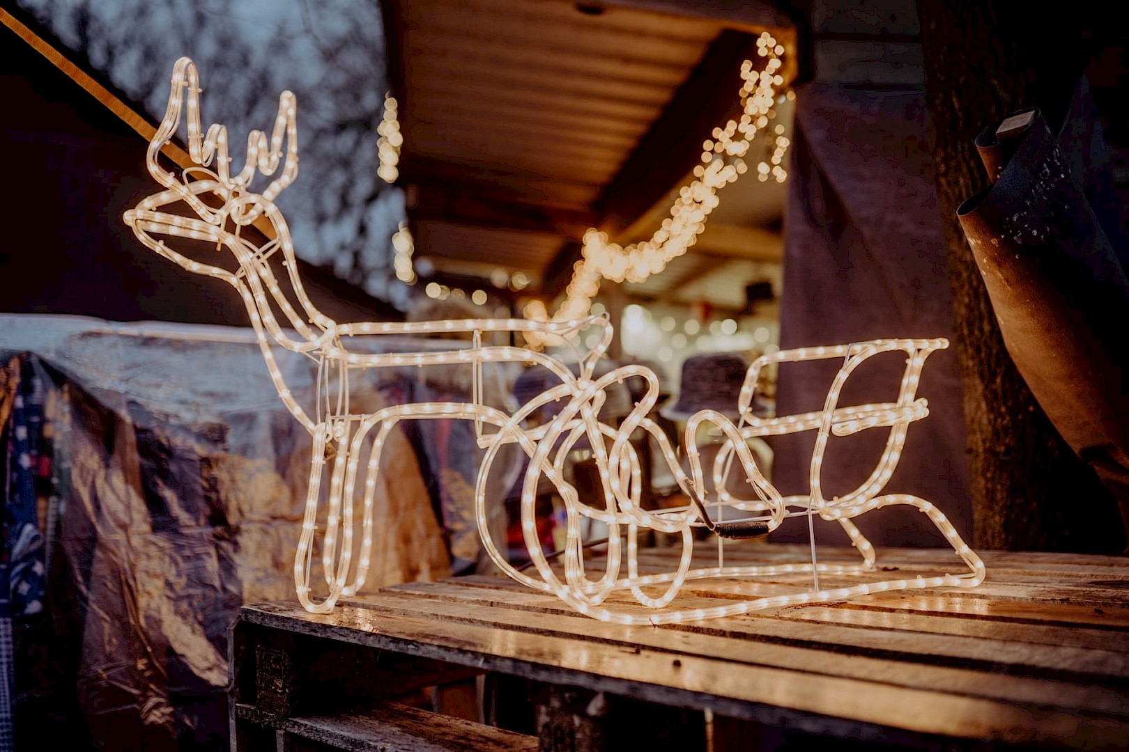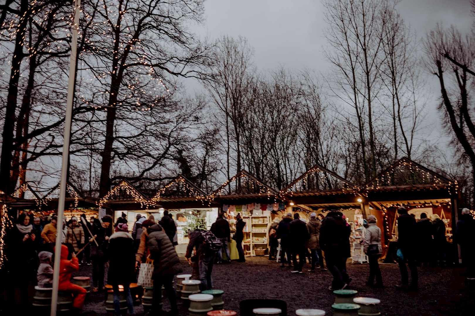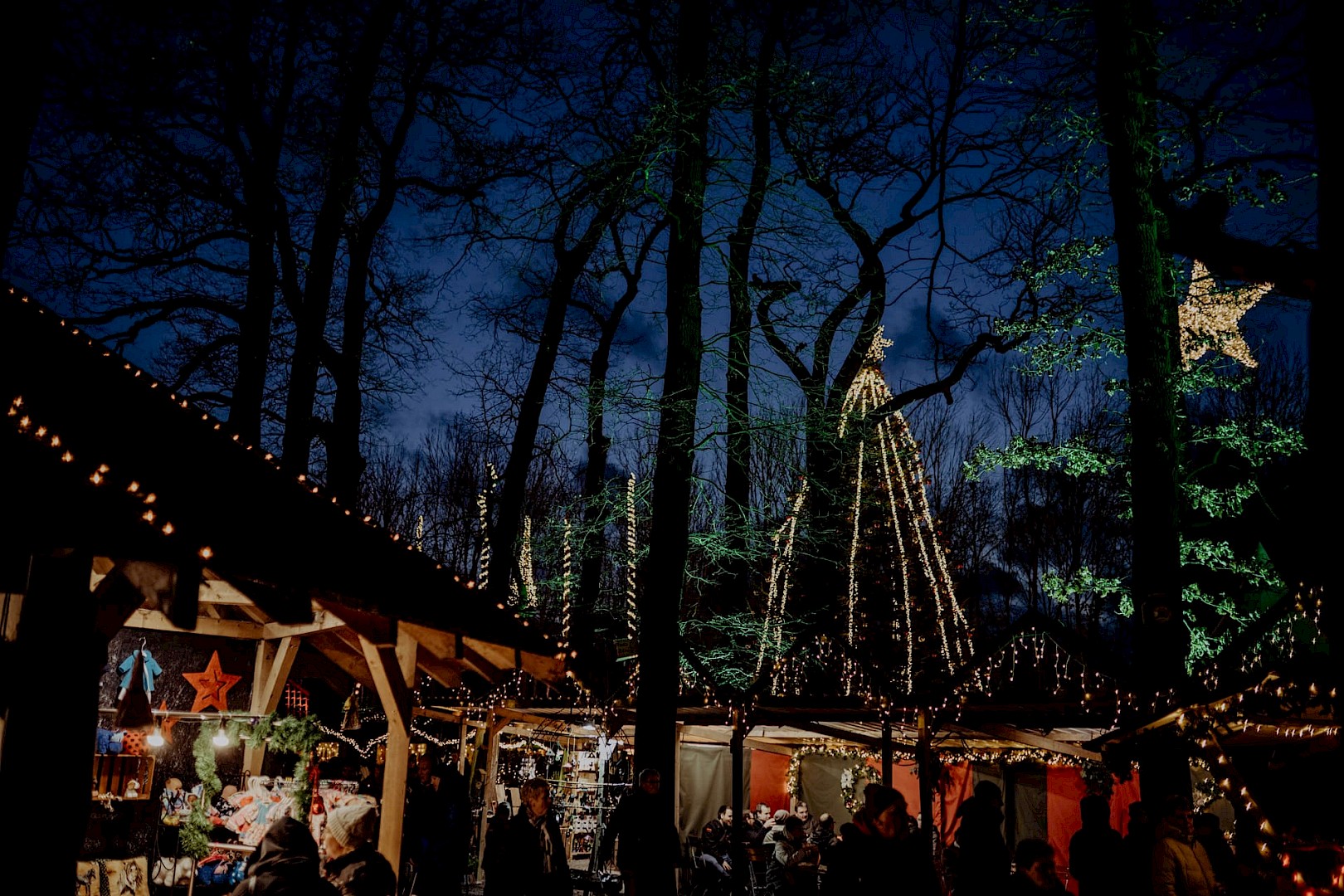 Mehr als eine Million Lichter tauchen das Waldstück und die umliegenden Plätze des Landguts in warmes, festliches Licht — ein Szenario, das als Winterwunderland wirklich bezaubert. Zwischen liebevoll dekorierten Holzhütten, Fachwerkgebäuden und verschlungenen Waldwegen erstreckt sich der Markt auf einer ca. 20.000qm großzügigen Freifläche, auf der Besucher durch stimmungsvolle Gassen flanieren können.